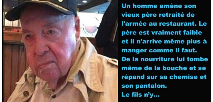 Un homme amène son vieux père retraité de l'armée au restaurant. Le père est vraiment faible et il n'arrive même plus à manger comme il faut.